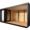 konstrukcja: rama stalowa z profili ocynkowanych, malowanych w dowolnym kolorze RAL, ściany (przód, tył i długi bok) podwójnie deskowane i ocieplone (sosna), blacha na rąbek na zewnątrz jako opcja; podłoga z ryflowanego, impregnowanego modrzewia, dach ze skosem w stronę długiego boku, pokryty blachą na rąbek
