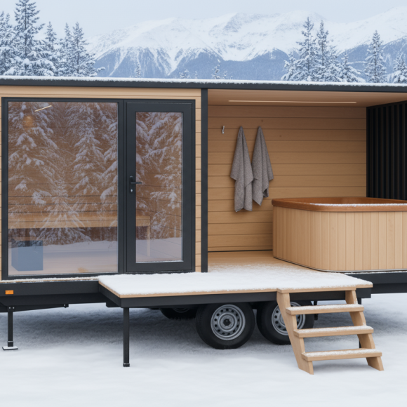 - sauna transportowana jest na specjalnie w tym celu zaprojektowanej przyczepie (6,0 x 2,5m plus 1,7m dyszel), jedno lub 2-osiowej (możliwa homologacja do 3.500 kg)